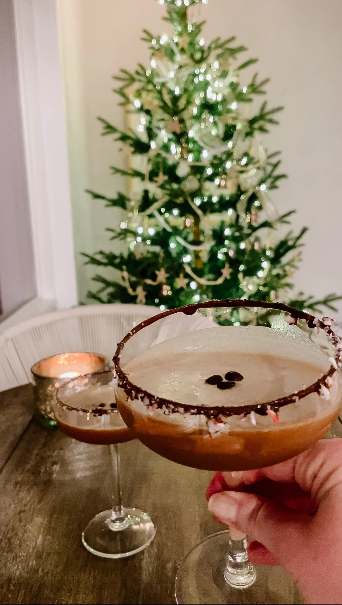 Add Tito’s, Kahlúa, espresso, coconut milk + ice to a mason jar. Shake generously! Dip martini glasses in melted chocolate and then crushed candy canes. Pour the martini, add espresso beans for garnish + enjoy!
